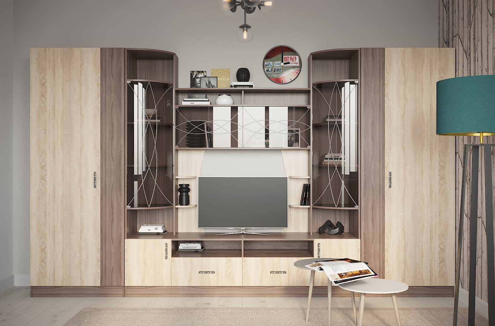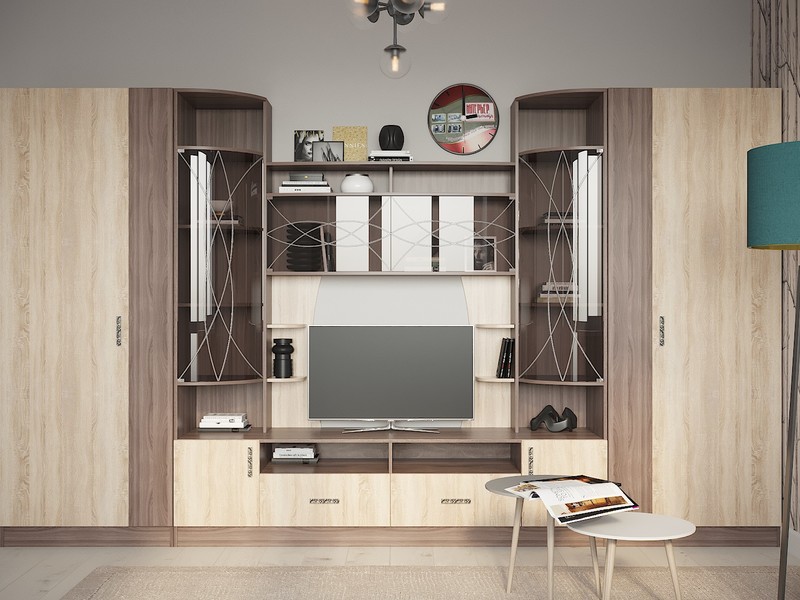 Стенка Мини-1 для гостиной "Марта-20" предназначена для размещения телевизора в гостиной, хранения декора, книг, аксессуаров. Стенка имеет открытые и закрытые полки, ниши. Секции витрины закрыты тонированными гнутыми стеклами с геометрическим орнаментом.